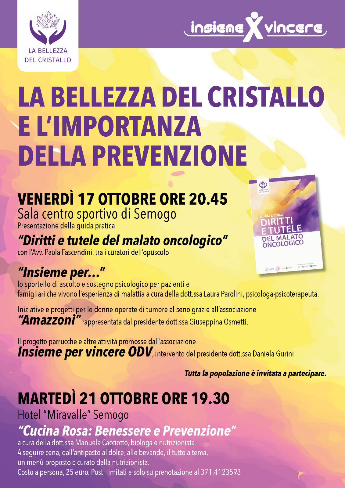 L'Associazione "Insieme per vincere" sostiene e promuove l'iniziativa "La bellezza del cristallo e l'importanza della prevenzione" presentata nella serata di venerdì' 17/10/2025 alle ore 20.45 presso la Sala Centro sportivo di Semogo e l'iniziativa "Cucina Rosa: Benessere e Prevenzione" presentata nella serata di martedì' 21/10/2025 alle ore 19.30 presso l'Hotel Miravalle a Semogo, per diffondere la più ampia informazione sulla prevenzione e malattie oncologiche. Le iniziative fanno parte del progetto più ampio "La Bellezza del Cristallo", un percorso gratuito e di sostegno per pazienti oncologici e i loro familiari, finanziato da Regione Lombardia.